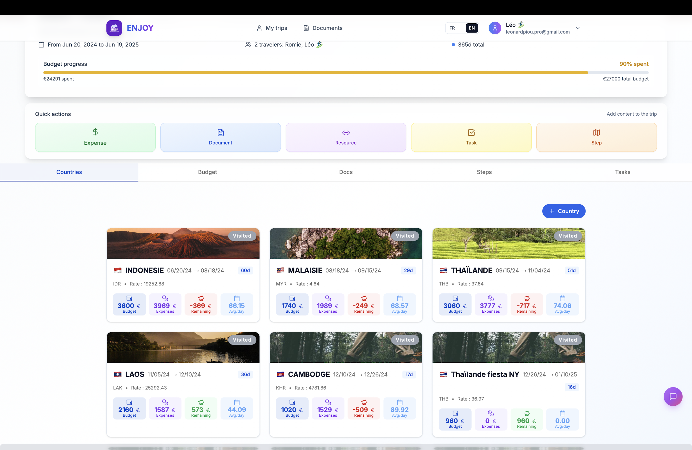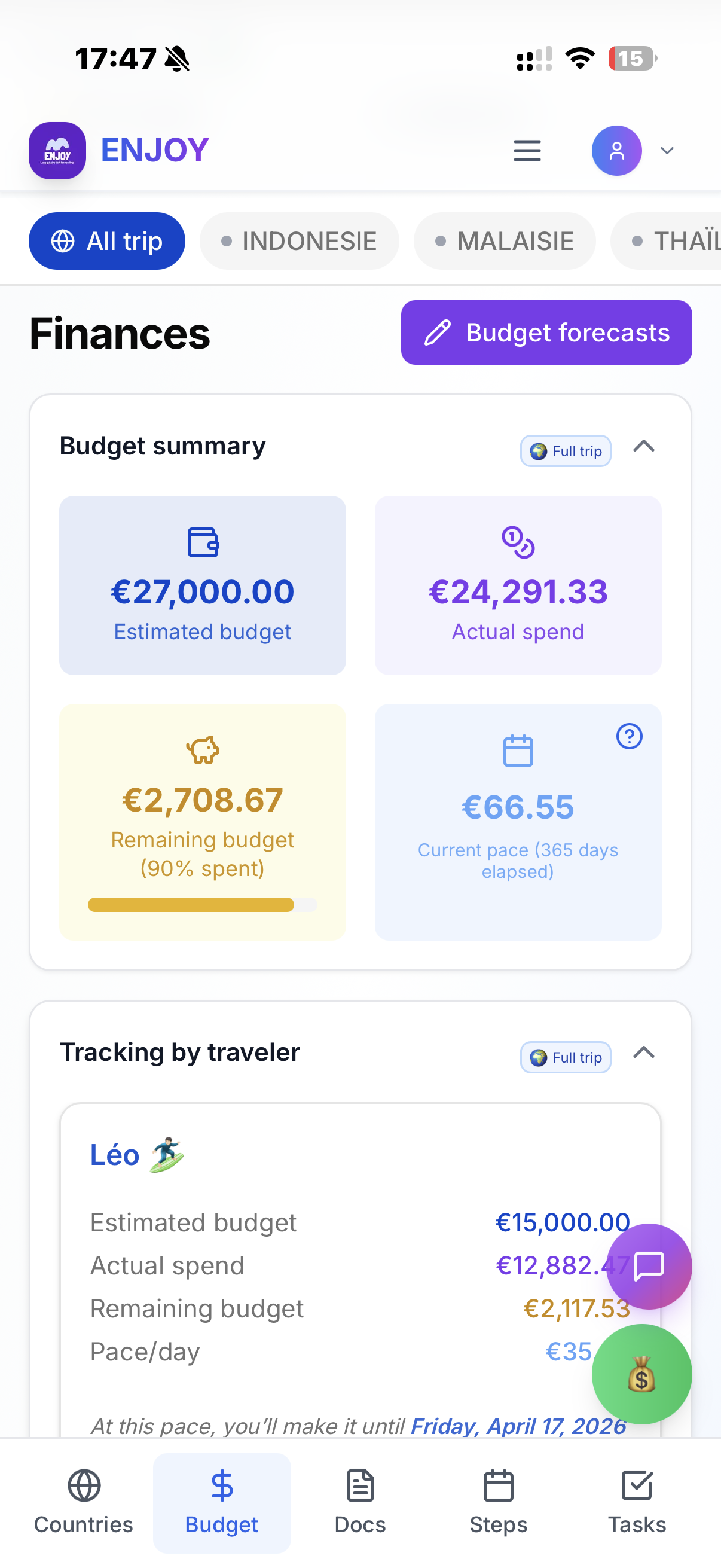 - Définis ton budget global ou par pays — l'app calcule ce qu'il te reste et combien de jours tu tiens